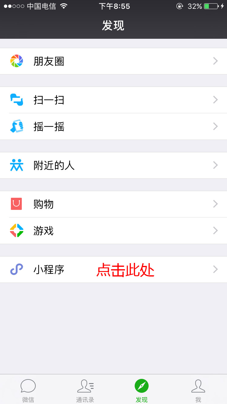 诸位看官,按下述操作找不到“小程序”按钮,尤其是第二步,说明你该升级你的微信版本了。