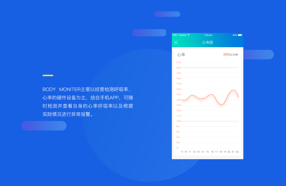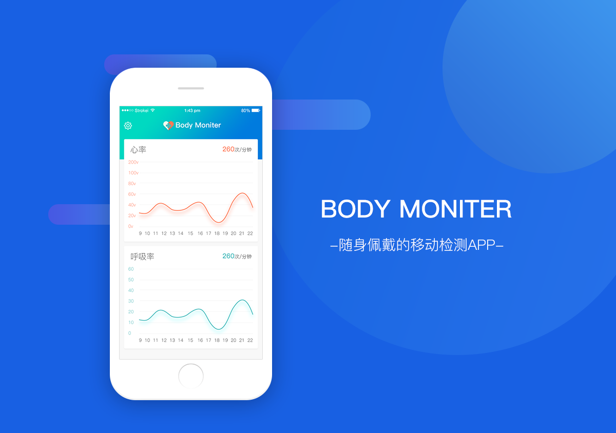 1.产品概述: body moniter是一款通过随身佩戴的移动设备连接手机APP的一款软硬件结合的互联网类型产品。 2.产品背景: i.客户背景情况: Body moniter主要以经营检测呼吸率、心率的硬件设备为主,结合手机APP,可随时检测并查看自身的心率呼吸率以及根据实际情况进行异常报警。 ii.客户做产品的初衷 硬件结合APP,使移动设备更加智能化。 3. 产品整体框架: 从移动设备上上传数据至APP端,通过APP记录实时数据,用户可设置阈值,低于或高于阈值的数据进行记录。