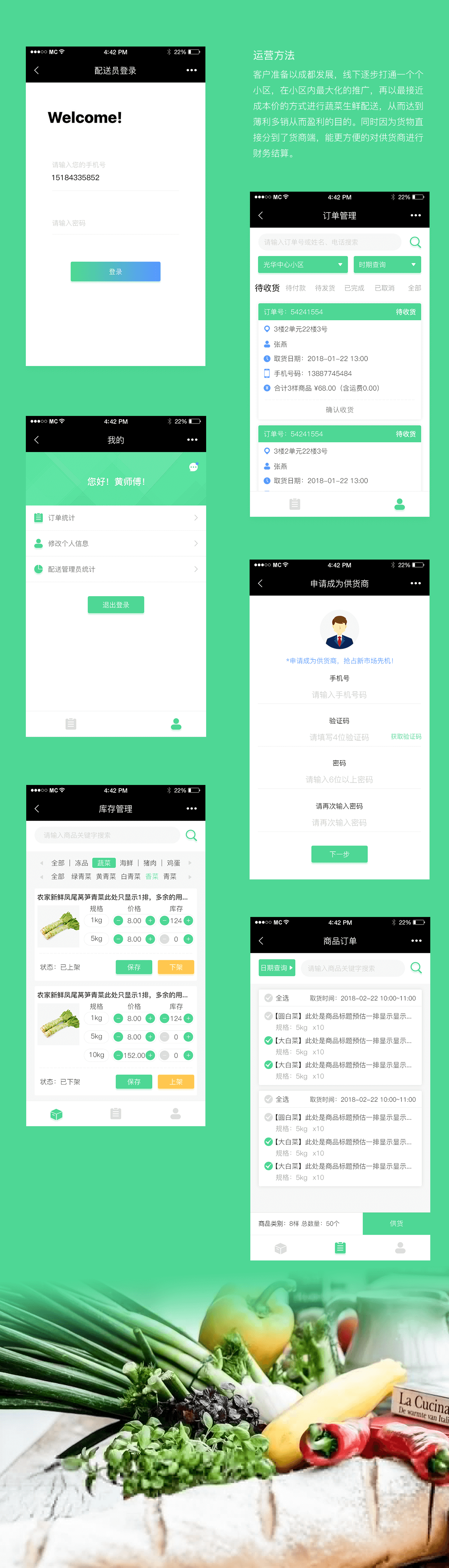 本产品是海鲜食品微信商城,用户通过平台预定商品,预定的商品直接下达至供货商(用户不知道有多个供货商),供货商集中供货到客户的物流中心,由物流中心统一进行分捻,分捻后由配送员按照小区进行配送。完成下单——供货商供货——物流中心分捻——发货——配送员送货——完成订单的流程。