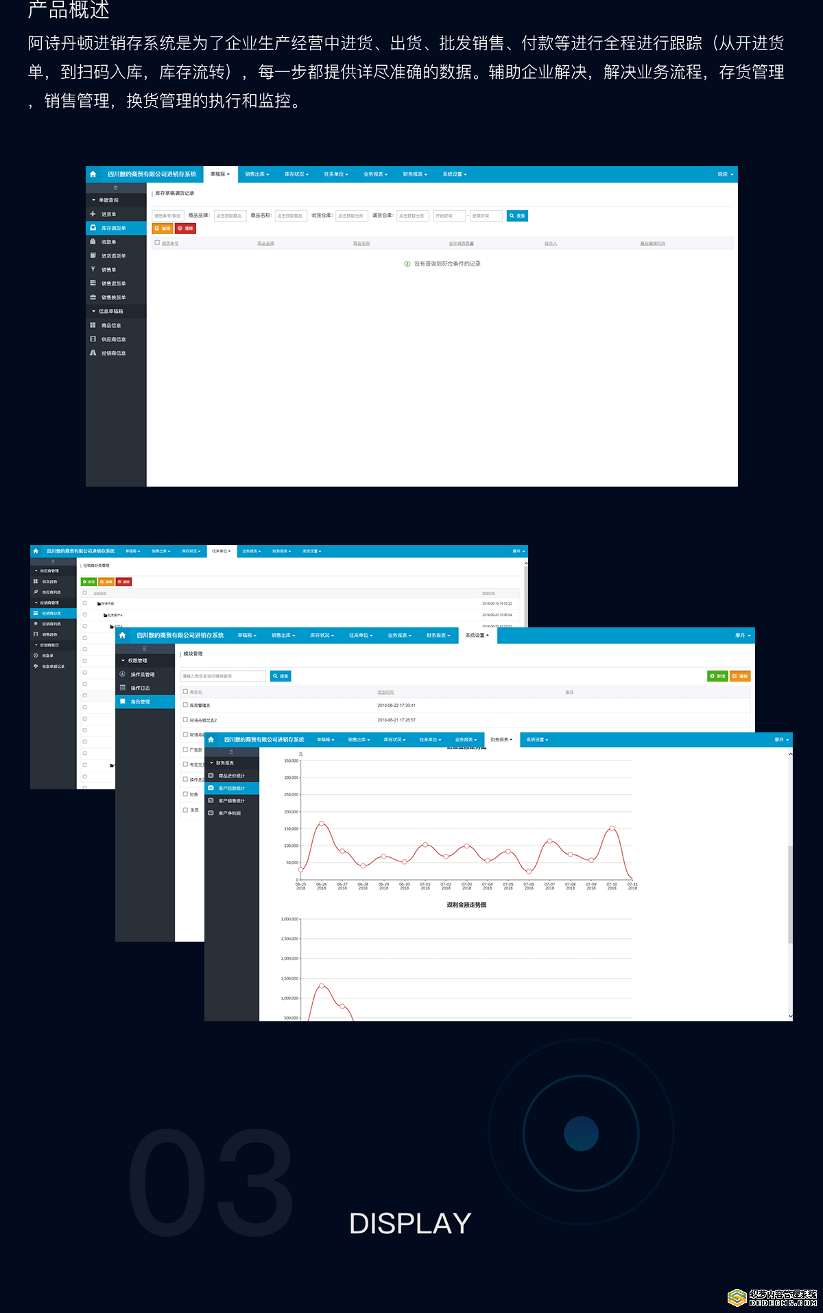 阿诗丹顿进销存系统是为了企业生产经营中进货、出货、批发销售、付款等进行全程进行跟踪(从开进货单,到扫码入库,库存流转),每一步都提供详尽准确的数据。辅助企业解决,解决业务流程,存货管理,销售管理,换货管理的执行和监控。